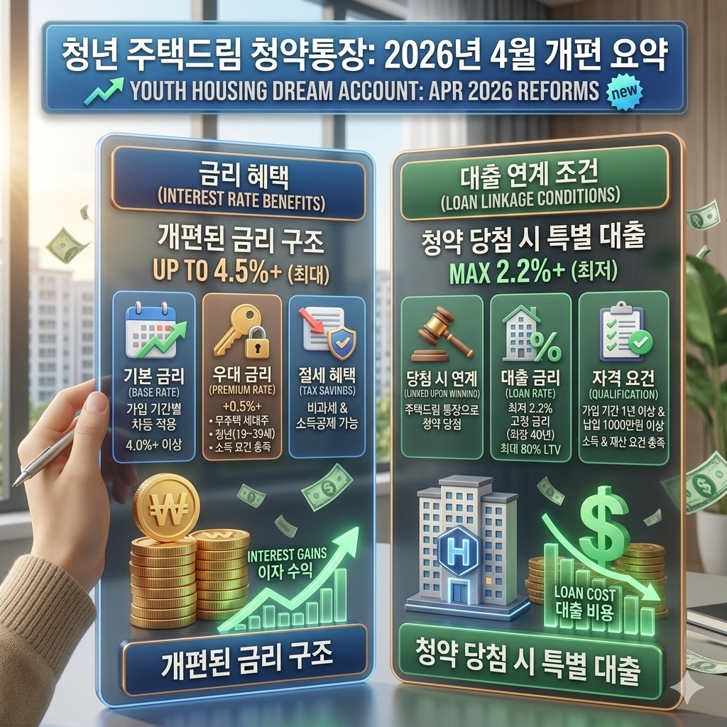 2026년 4월 청년 주택드림 청약통장 대변혁! 월 납입 인정액 25만 원 상향부터 최저 2.2% 금리의 대출 치트키까지, 내 집 마련의 꿈을 박살 낼 모든 정보를 편집장 6ks가 전해드립니다.